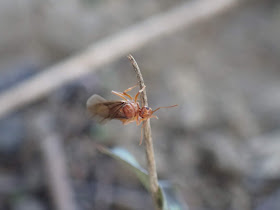 Prenolepis imparis, the Winter Ant. Their queens are beautifully colored, they fly early in the year along side a lot of our earliest native wildflower and sometimes the two "blooms" line up. That's not the case here, but I'm glad to say I didn't have to stage this photo; I walked out in my garden one day and saw it happening.